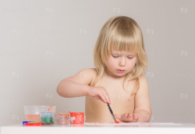 Очаровательная девочка рисует красками на бумаге, сидя за столом