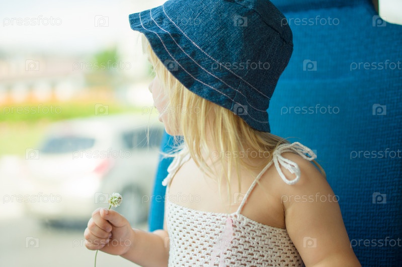 Ребенок в белом платье и шапочке с цветком в автобусе