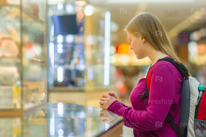 Молодая женщина перед витриной в торговом центре