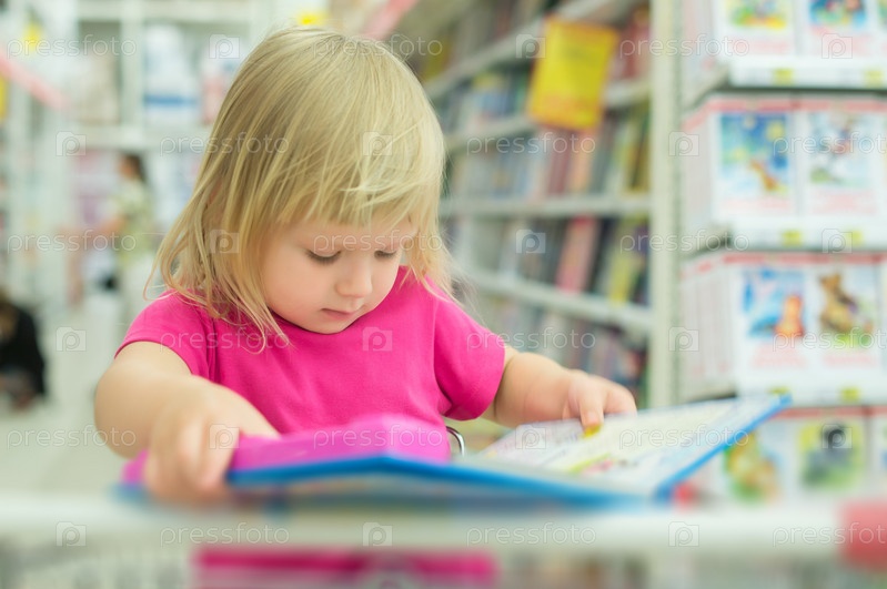 Очаровательная девочка с интерактивной книгой в корзине в супермаркете