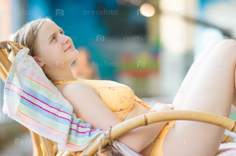 Расслабленная молодая женщина в кресле в аквапарке