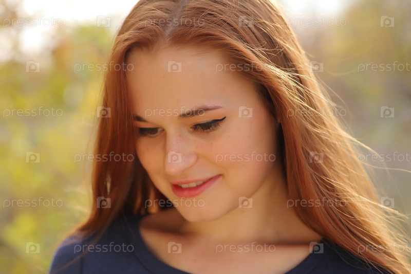 Рыжая молодая женщина в парке