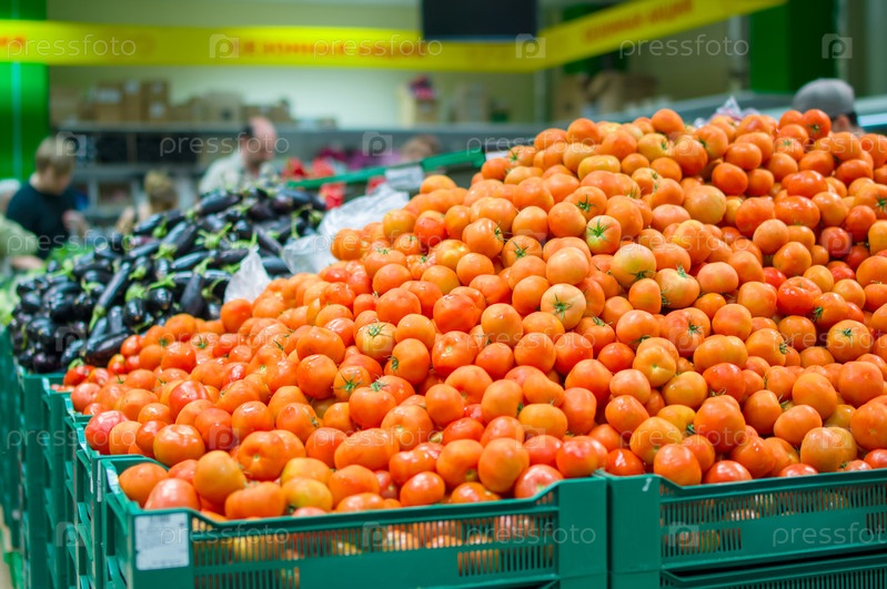 Куча свежих помидоров в ящиках в супермаркете