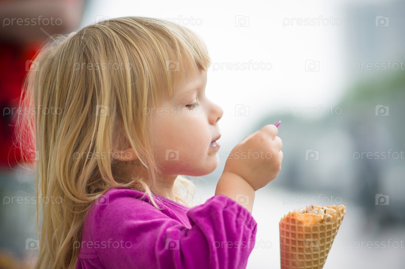 Очаровательная девочка ест мороженое у торгового центра