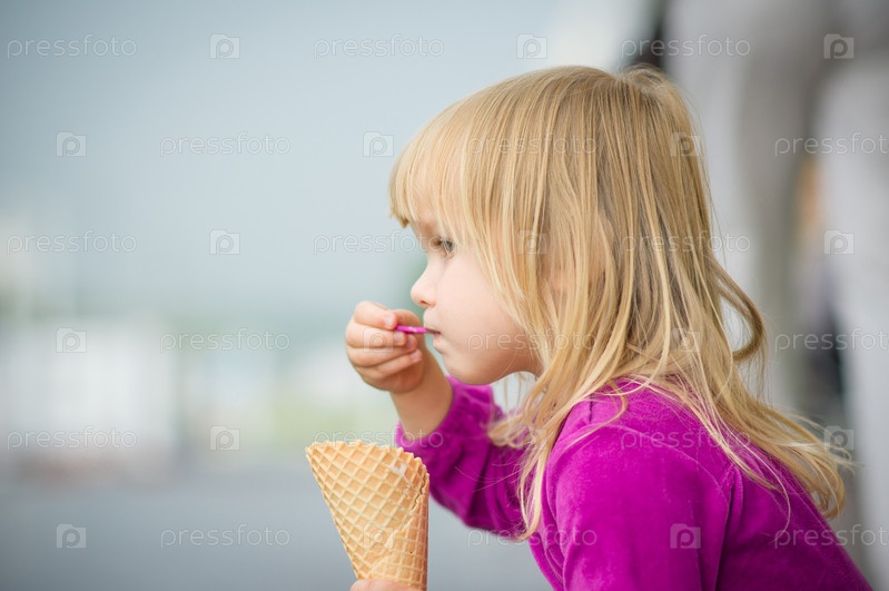 Очаровательная девочка ест мороженое у торгового центра