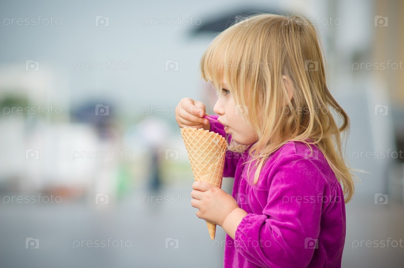 Очаровательная девочка ест мороженое у торгового центра