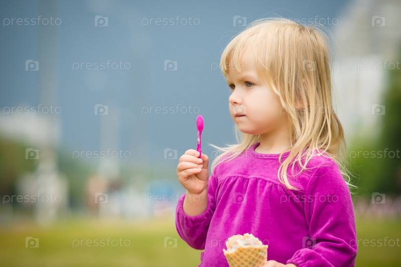 Очаровательная девочка ест мороженое на газоне у торгового центра