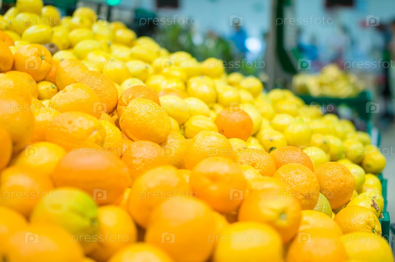 Апельсины и лимоны в ящиках в супермаркете
