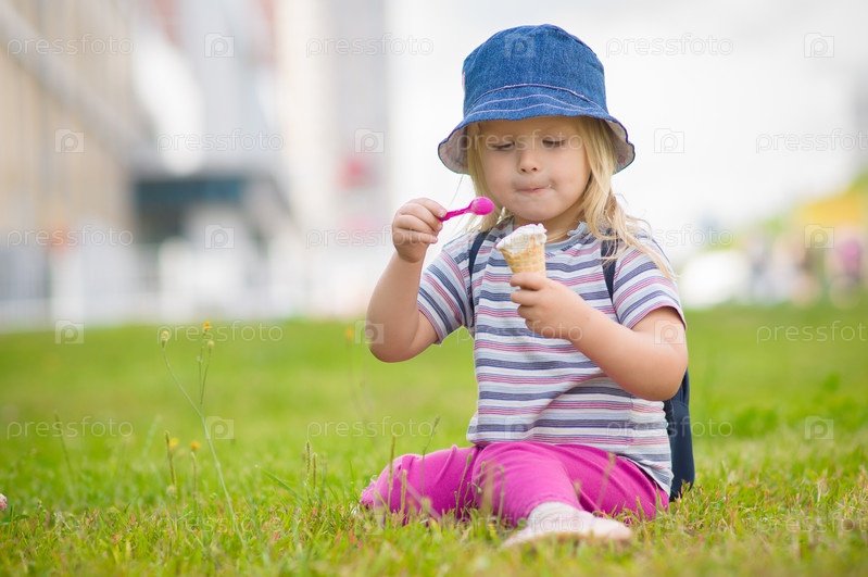 Очаровательная девочка в синей шляпе ест мороженое, сидя на траве