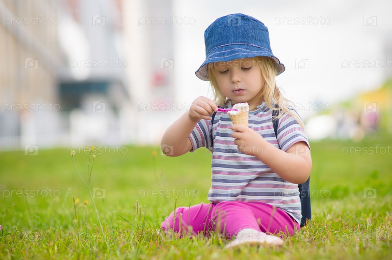 Очаровательная девочка в синей шляпе ест мороженое, сидя на траве