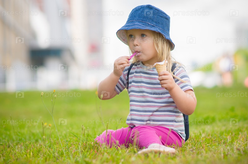 Очаровательная девочка в синей шляпе ест мороженое, сидя на траве