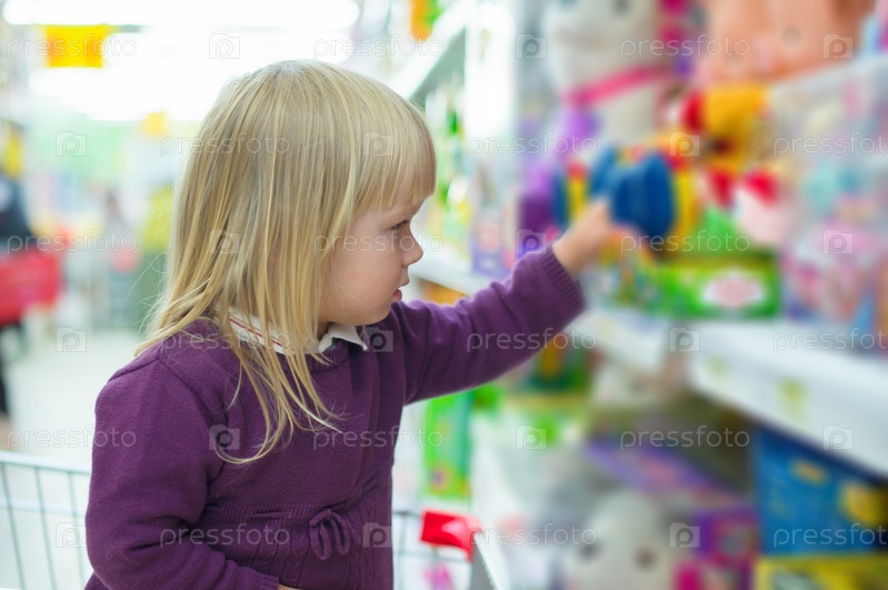 Очаровательный ребенок с игрушками на полках в торговом центре