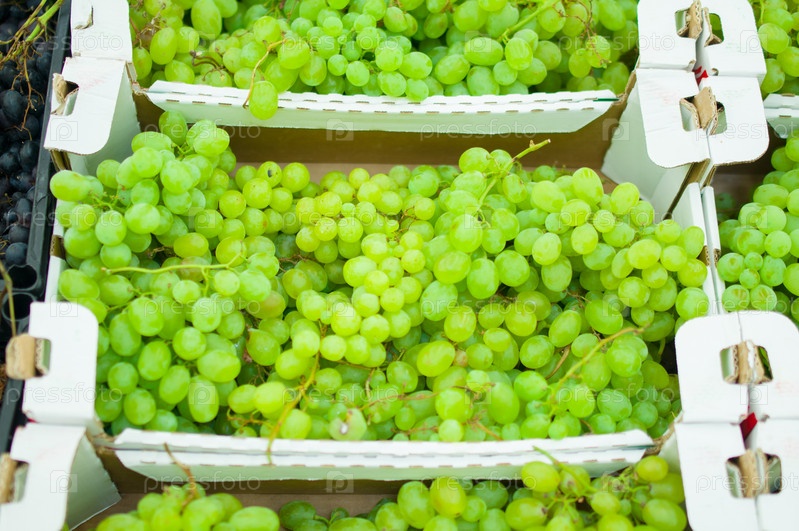 Зеленый виноград в коробках в супермаркете