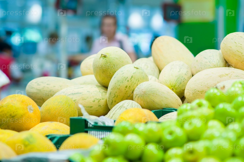 Дыни и зеленые яблоки в супермаркете