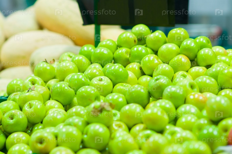 Кучах свежих зеленых яблок в супермаркете