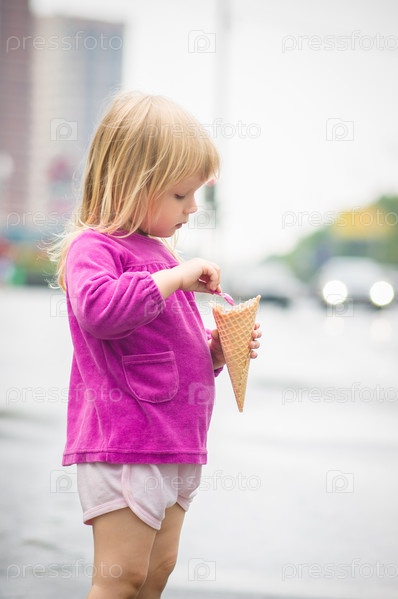 Очаровательная девочка ест мороженое на автобусной остановке