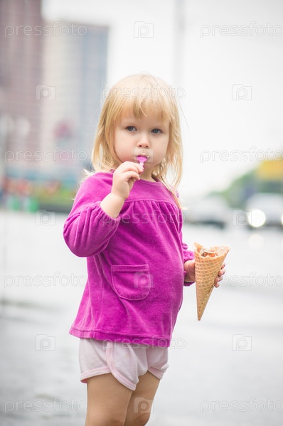 Очаровательная девочка ест мороженое на автобусной остановке