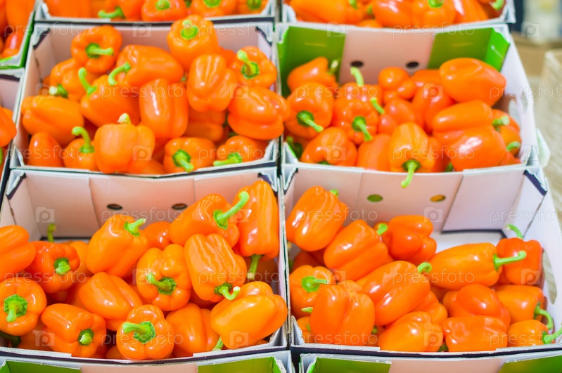 Куча оранжевых перцев в коробках в супермаркете