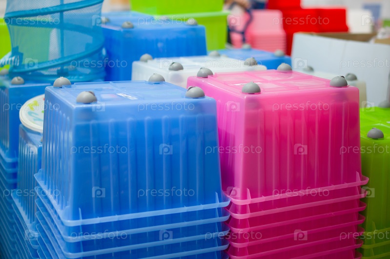 Пластиковые цветные коробки и аксессуары в супермаркете