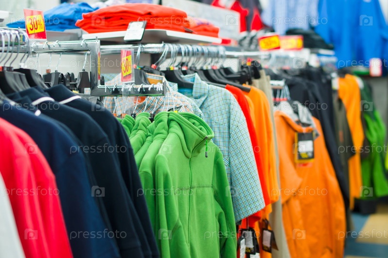 Рубашки и футболки на витрине в супермаркете
