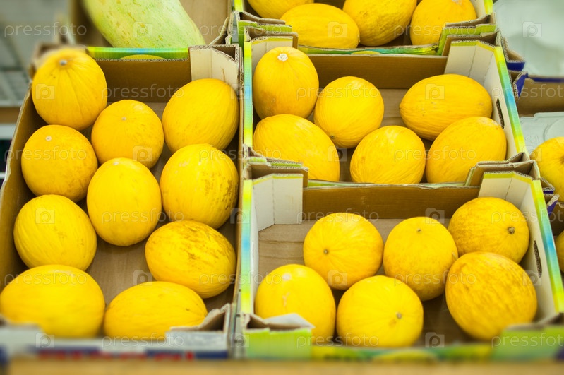 Желтые дыни в ящиках в супермаркете