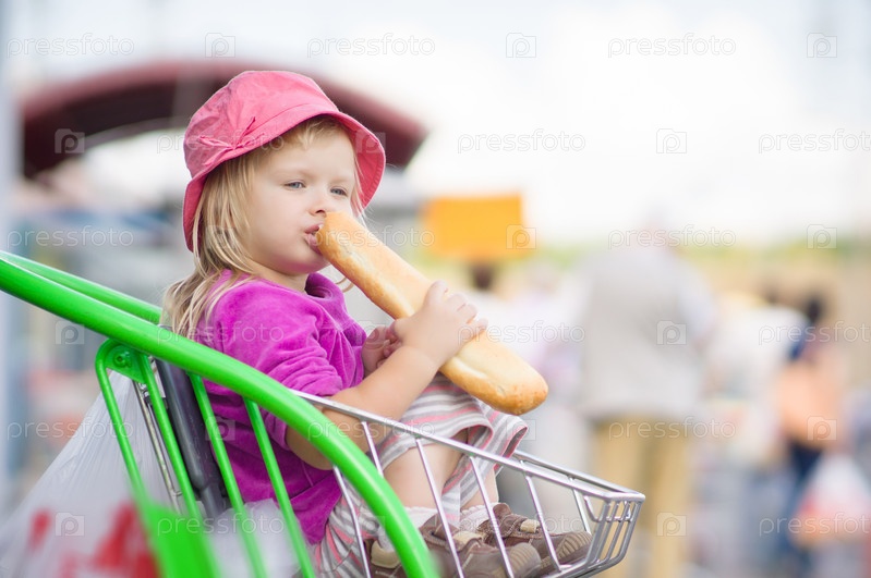 Очаровательная девочка ест хлеб, сидя в тележке в супермаркете