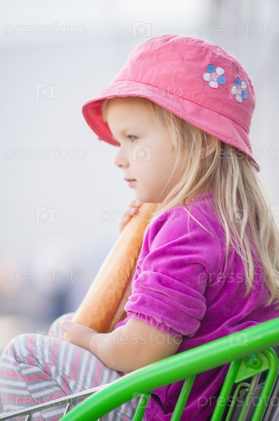 Очаровательная девочка ест хлеб, сидя в тележке в супермаркете