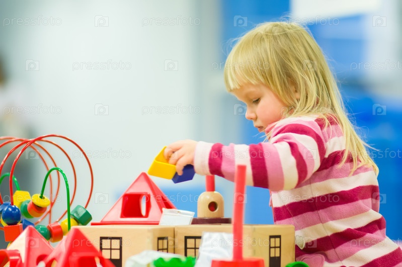 Очаровательная девочка с игрушками на столе в торговом центре