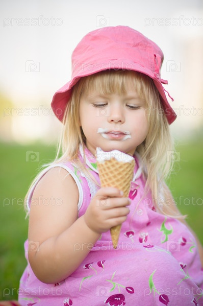 Очаровательная девочка в розовой панамке ест мороженое, сидя на траве в парке