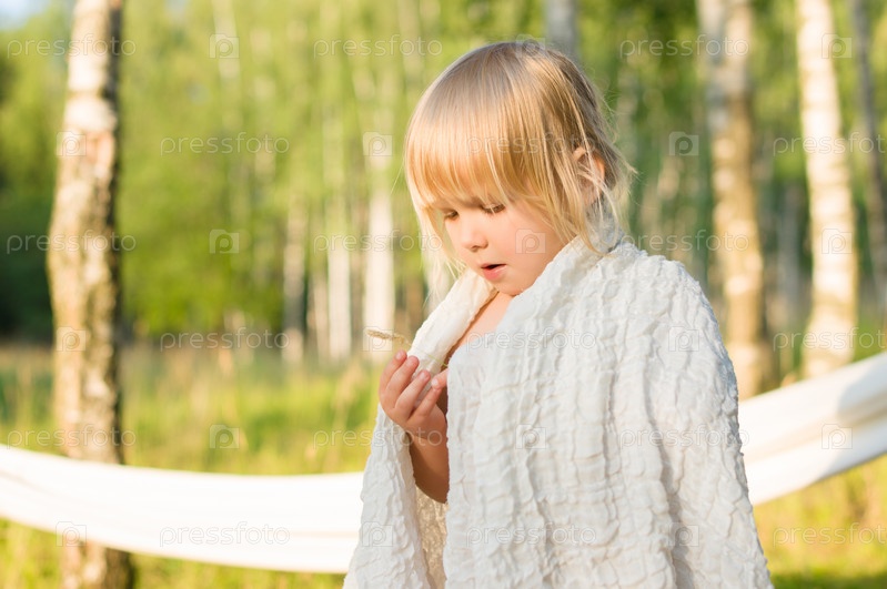 Очаровательная девочка в белом покрывале в парке