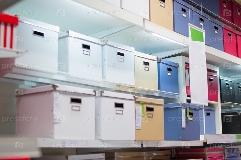 Цветные коробки для документов и товаров на полках в супермаркете