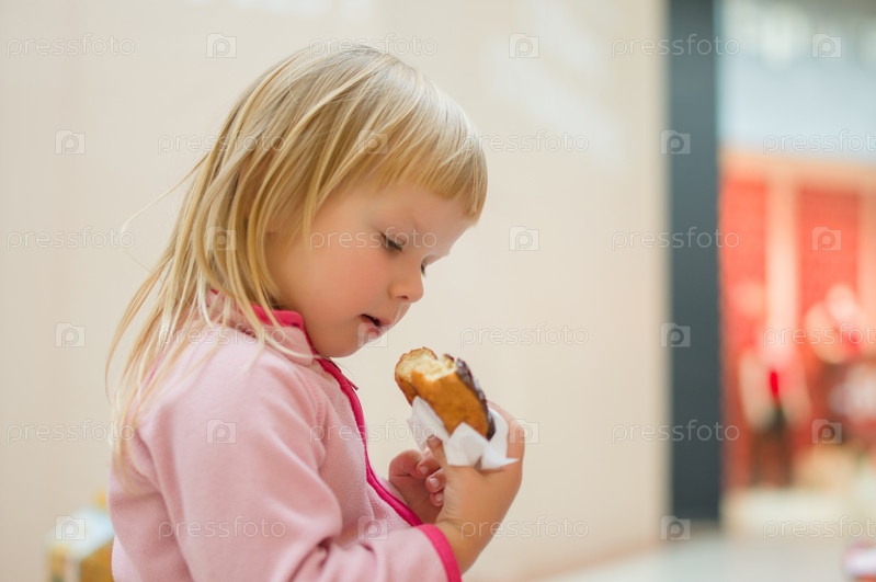 Очаровательный ребенок ест пончик с шоколадом, держа его с салфетке, в торговом центре