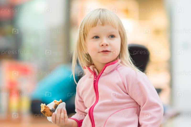 Очаровательный ребенок ест пончик с шоколадом, держа его с салфетке, в торговом центре