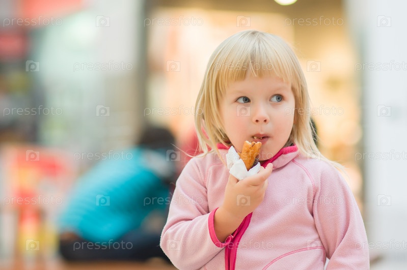 Очаровательный ребенок ест пончик с шоколадом, держа его с салфетке, в торговом центре