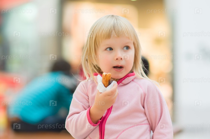 Очаровательный ребенок ест пончик с шоколадом, держа его с салфетке, в торговом центре