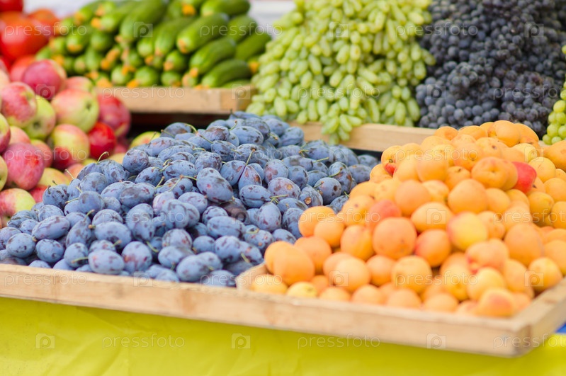 Сливы, абрикосы, яблоки, огурцы, виноград на рынке
