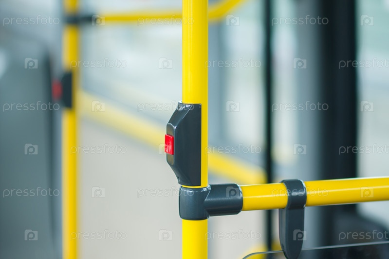 Интерьер современного городского автобуса с кнопкой предупреждения об остановке