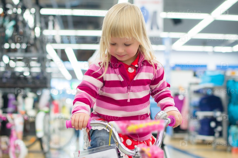 Очаровательная девочка на маленьком велосипеде в супермаркете