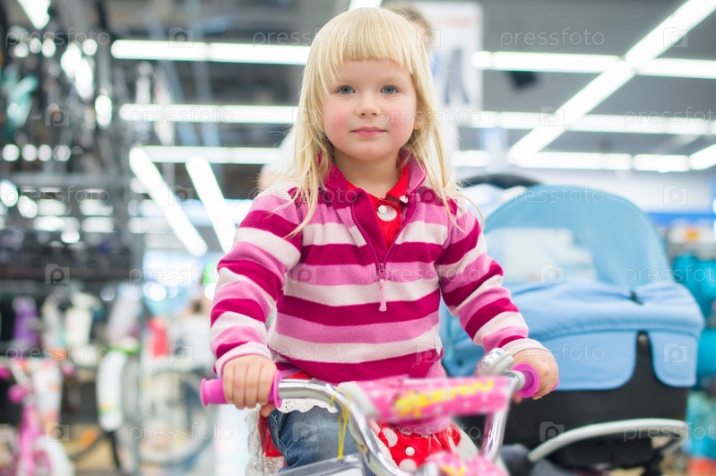 Очаровательная девочка на маленьком велосипеде в супермаркете
