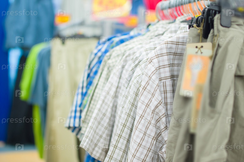 Яркие рубашки и брюки на витрине в супермаркете