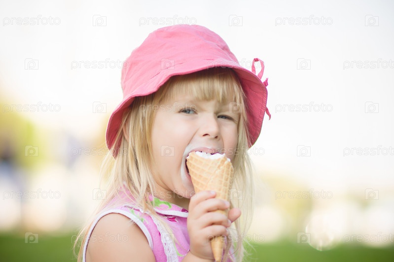Девочка в розовой шляпке ест мороженое, сидя на траве