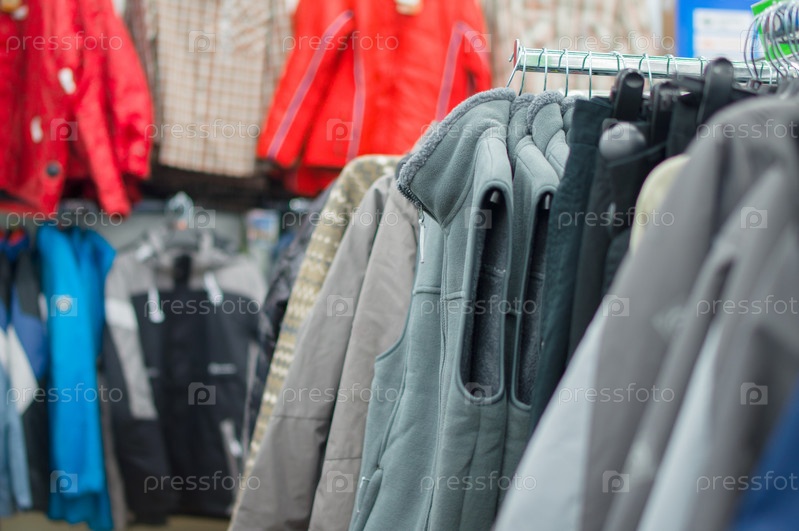 Куртки, жилеты и джемперы на витрине в супермаркете