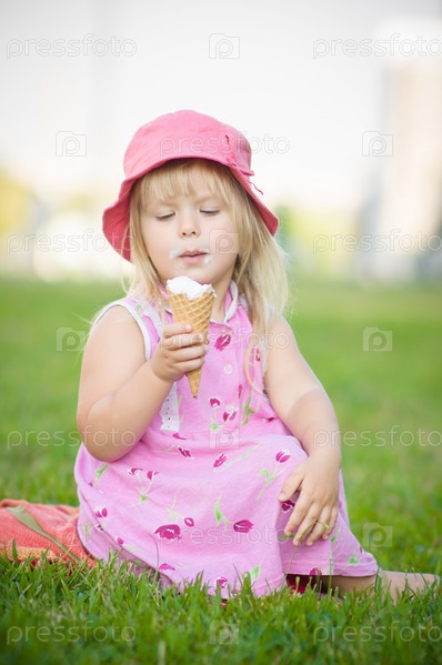 Девочка в розовой шляпке ест мороженое, сидя на траве