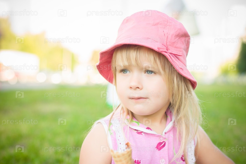 Девочка в розовой шляпке ест мороженое, сидя на траве