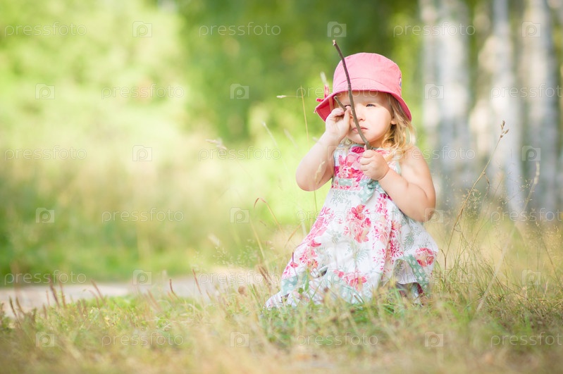 Очаровательная девочка в красной шляпе играет с веткой в парке
