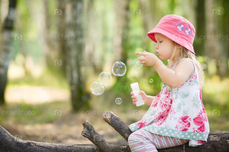 Очаровательный ребенок пускает мыльные пузыри в парке