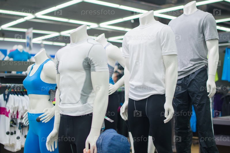 Манекены в спортивной одежде на витрине в супермаркете
