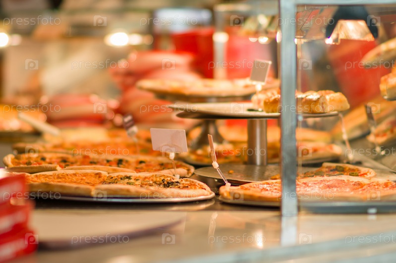 Пиццы на витрине в ресторане быстрого питания в торговом центре
