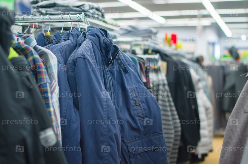 Куртки, жилеты и джемперы на стендах в супермаркете