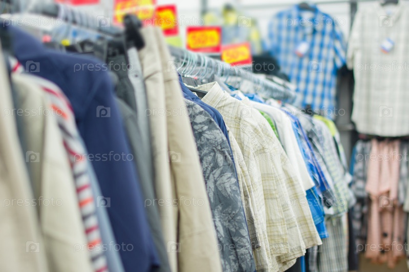 Майки и брюки на стендах в супермаркете
